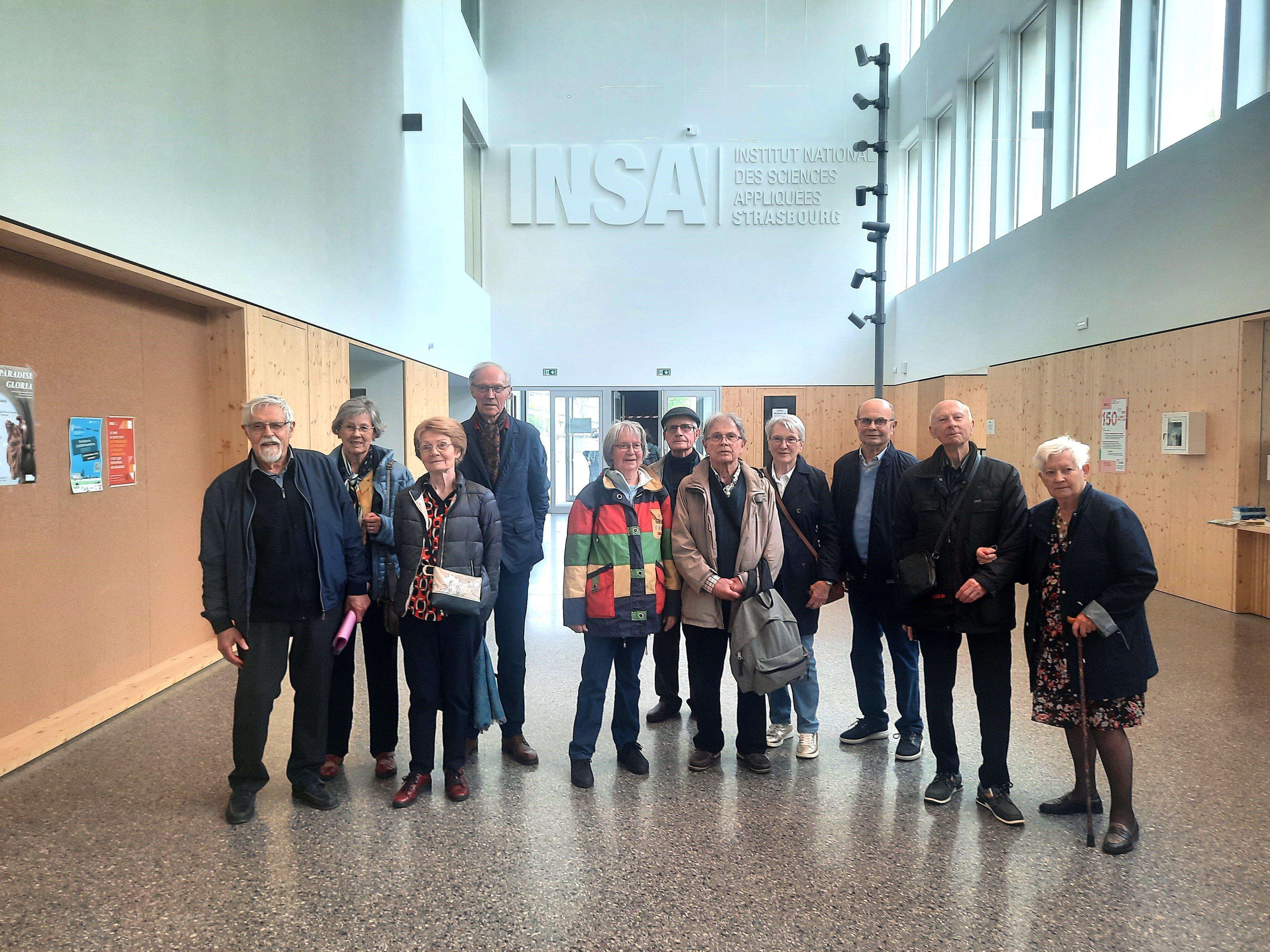 C’est ainsi que les 6 diplômés concernés (venant de la région parisienne, de Nantes, et d’Alsace), accompagnés de 5 épouses, se sont retrouvés à Strasbourg le vendredi 25 avril 2025 pour déjeuner dans un restaurant proche de l’école et ensuite la visiter puis le « foyer » (devenu Maison de l’Ingénieur et de l’Architecte). Les retrouvailles au restaurant furent un moment fort d’échange de souvenirs et le quitter fut difficile car nous avions beaucoup de choses à nous raconter. La visite de l’école nous a permis de mesurer son évolution par rapport à notre époque, tant du point de vue des bâtiments que de la pédagogie. Plusieurs professeurs ont pris le temps de nous expliquer leur travail en faisant aussi témoigner des étudiants, ce qui a été très enrichissant. Nous avons été impressionnés par la transformation de la MIA1 où les blocs de 4 petites chambres avec douche commune sont devenues des studios de 19 m² avec kitchenette et toilettes ; il ne manque que le lave-vaisselle !