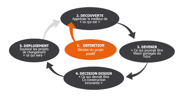 Appréciative Inquiry : Méthode participative et constructive au service du développement des organisations et des équipes, les applications de l’Exploration Appréciative sont nombreuses ; elles vont du diagnostic social ou organisationnel, à la cohésion d’équipe jusqu’à l’innovation pour une meilleure organisation. Née à la fin des années 80, l’Appréciative Inquiry est une approche créée par D. Cooperrider (Dr en psychologie des organisations) et a pour parti pris une focalisation intentionnelle sur ce qui donne vie et force à l’organisation. Elle prend appui sur les dernières recherches de la psychologie positive et des neurosciences. Elle se décline en 5 étapes dites méthode des 5D :